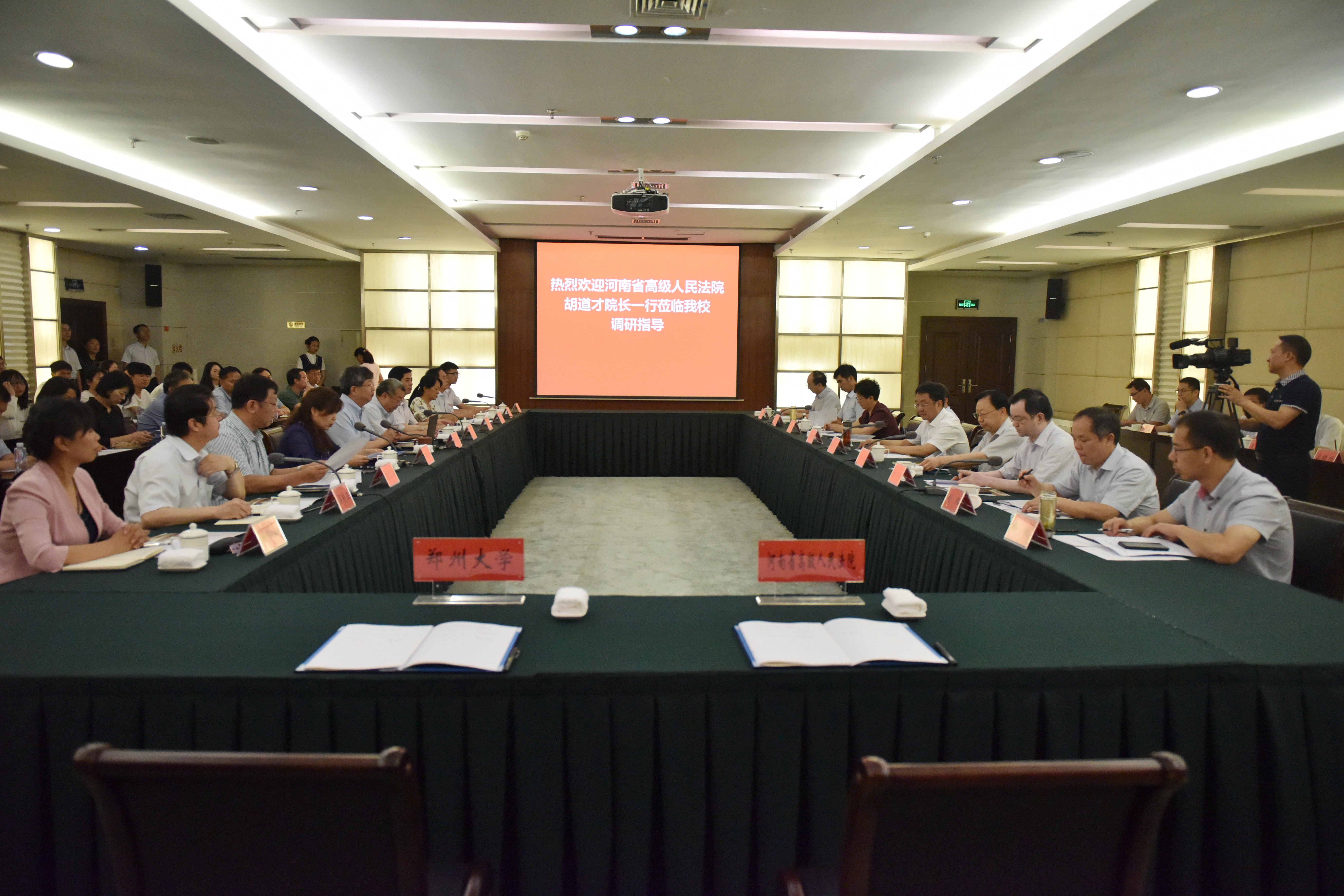 刘炯天对胡道才一行表示欢迎,对省高院长期以来的支持表示感谢,并从基本情况、一流规划、学科布局、综合改革、部省合建五个方面介绍了学校一流大学建设情况。他指出,河南有悠久的法学研究历史,郑州大学法学学科也有着坚实的学科基础和完备的人才培养体系,是学校一流大学建设的有力支撑,在服务国家法治建设特别是河南省法治人才培养、理论研究方面发挥了重要作用。他表示,省高院与郑州大学有良好的合作基础,共建“法律研究生工作站”是双方深化合作的重要举措。希望双方以协议签订为新起点,充分发挥人才优势、科研优势和创新优势,着力深化人才培养、培训合作、研究合作,携手打造院校合作共建的典范,为全面推进依法治国、助力中原更加出彩提供强有力的法治保障。