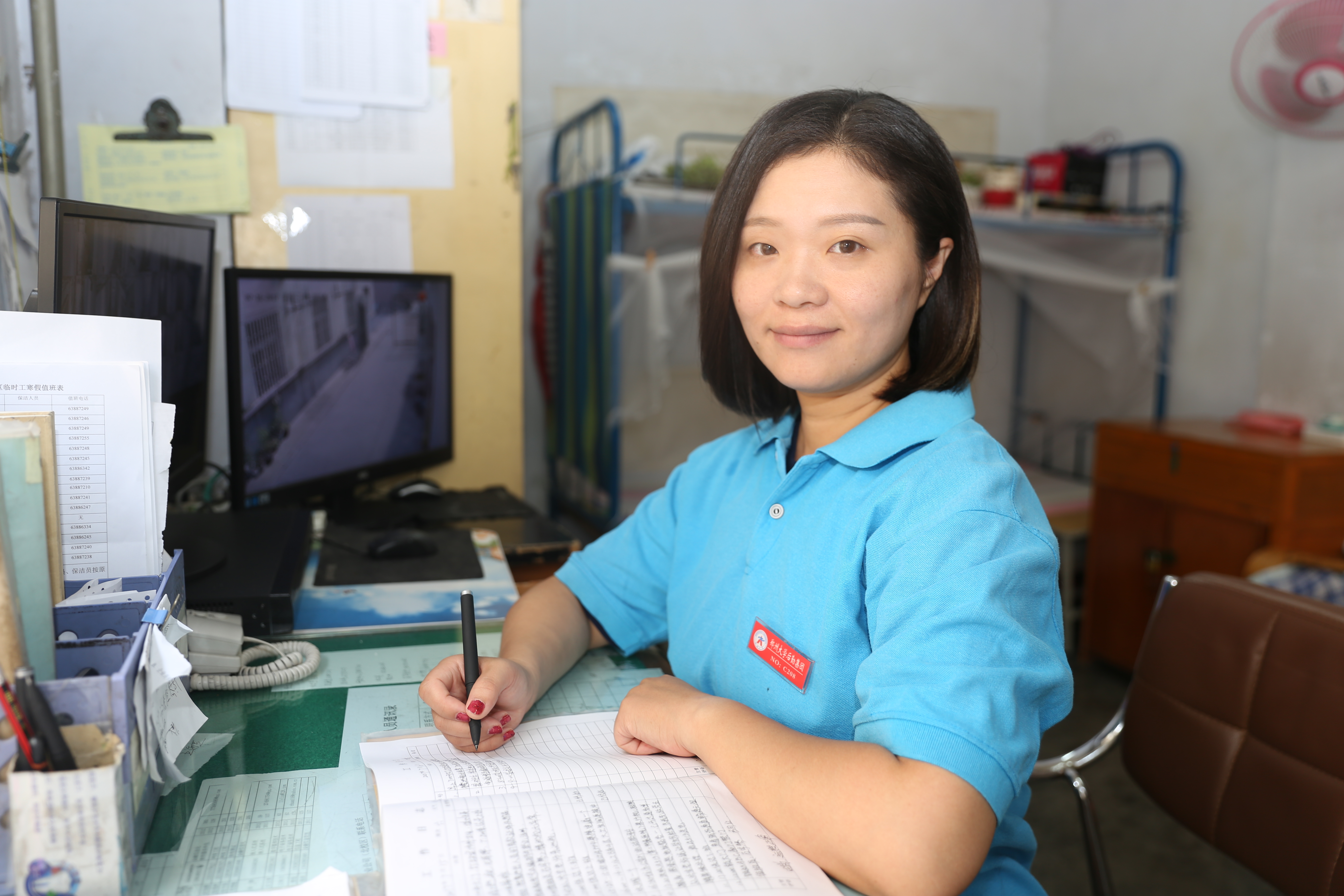 学生的安全与健康是周庆华的心头肉,丢不得。每天的工作任务是早晚巡视楼内楼外的每一个角落,看看消防通道、安全门以及检查水楼头、门窗、洗手间是否有故障。24小时值班除了晚上休息时间,都在盯着门口和监视器,看看是否有陌生人混人楼内,她也炼就了一双火眼金睛和一颗最强大脑,熟悉1217个面孔,能叫出大部分学生的名字。