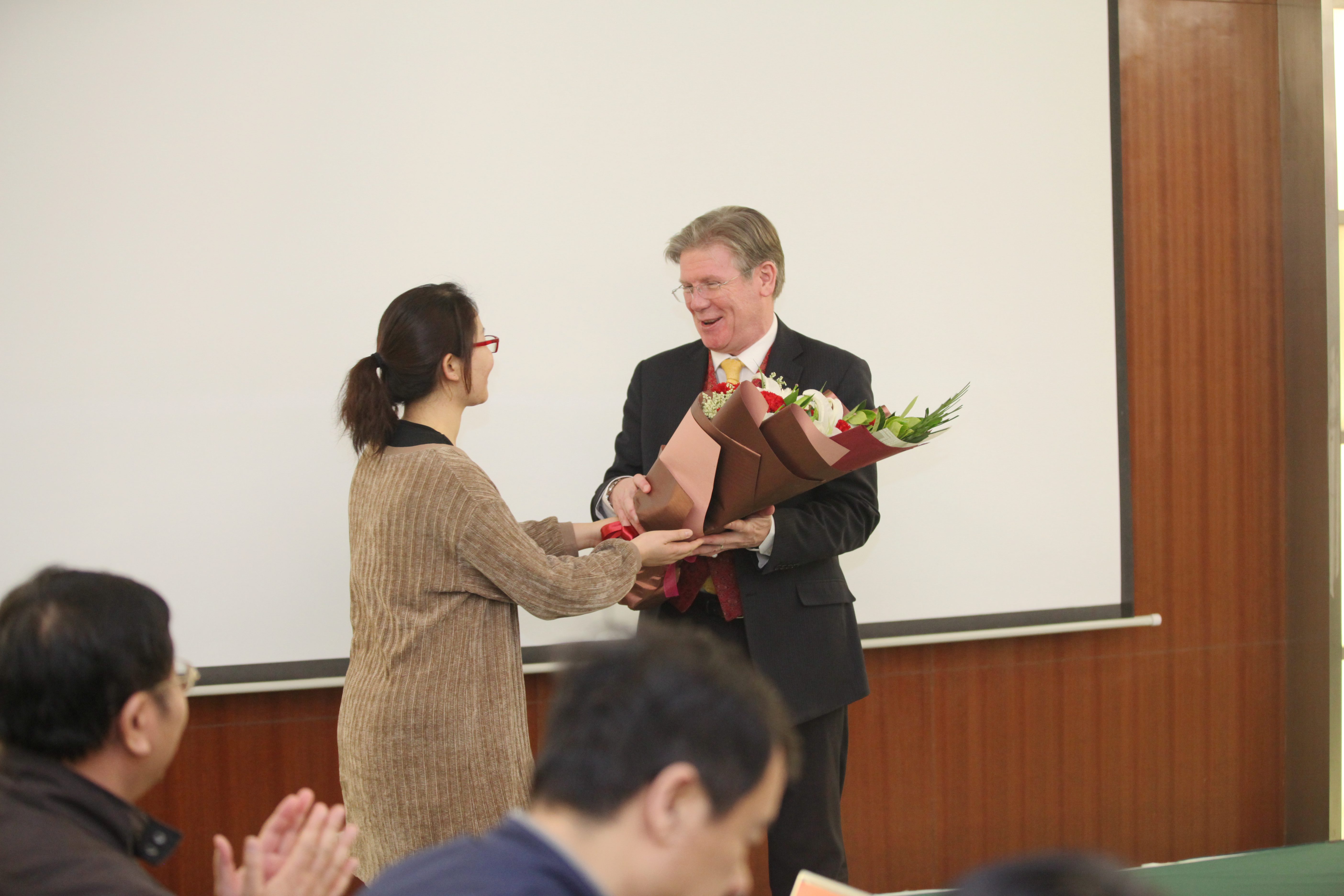 校党委副书记邢莹首先宣读了中国工程院2017年院士增选结果,本次增选共有18位外籍专家当选为中国工程院外籍院士,我校医学科学院院长尼古拉斯·罗伯特·莱蒙教授为其中之一。随后,副校长吴宏阳宣读了中国工程院致尼克·莱蒙院士的贺信。医学科学院学生代表向尼克·莱蒙院士献花。