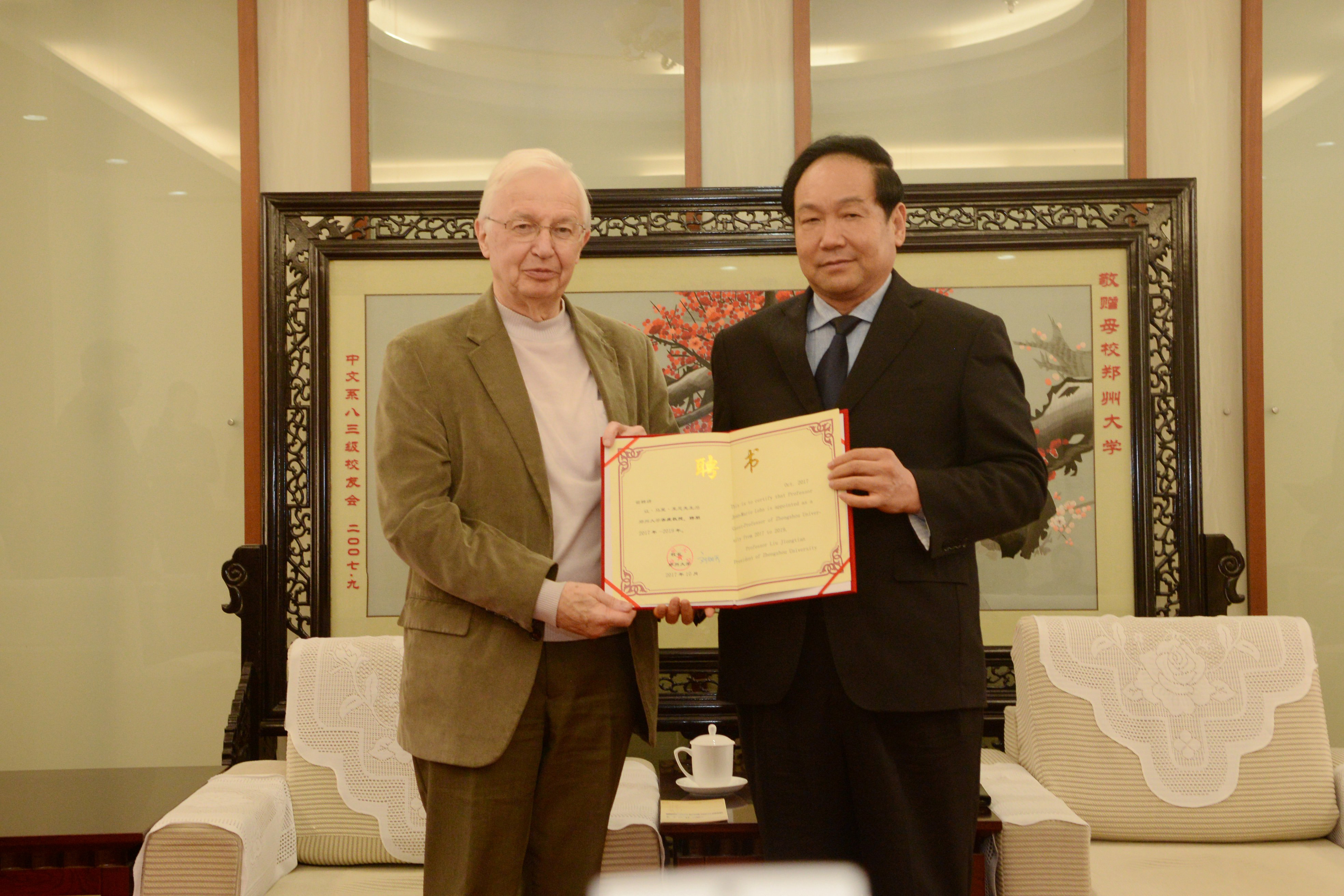 牛书成书记为莱恩教授颁发了郑州大学客座教授聘书