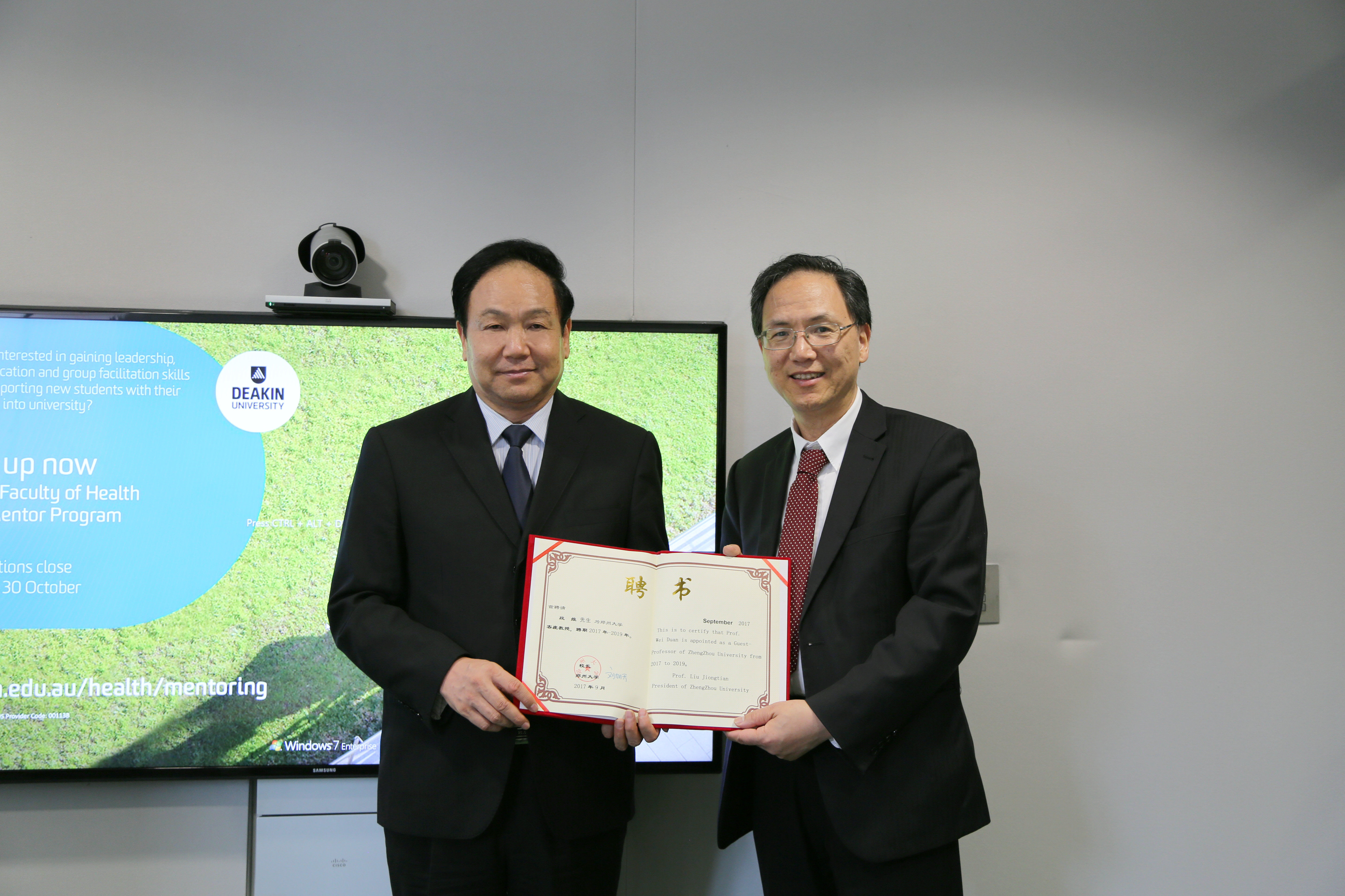 校党委书记牛书成为迪肯大学段维教授颁发郑州大学客座教授聘书