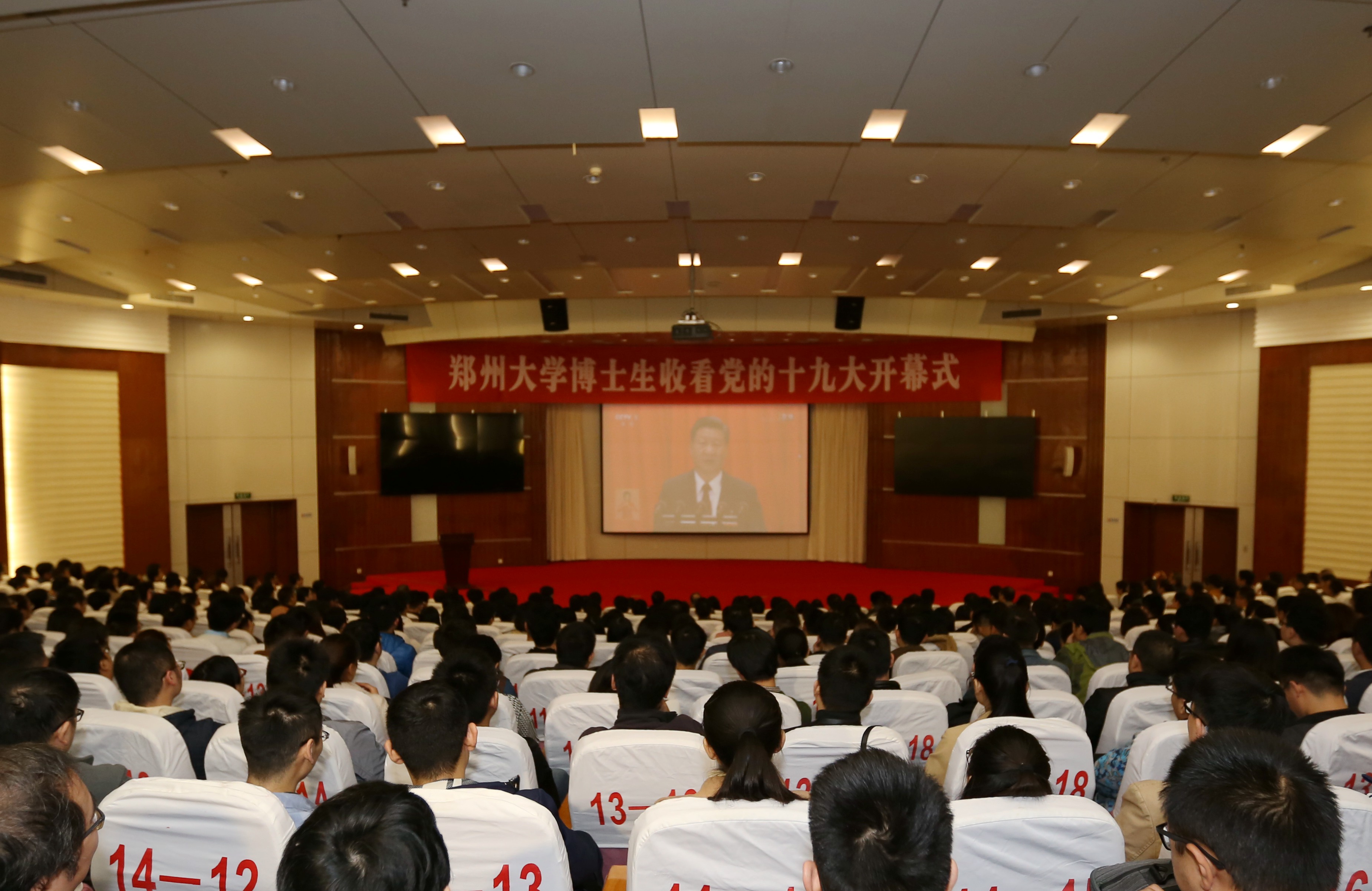 郑州大学党委高度重视,提前部署,组织广大干部师生积极收听收看十九大开幕式的盛况。按照学校统一安排,校领导牛书成、邢莹、屈凌波、李兴成、贾少鑫、谷振清、许东升、关绍康、韩国河、吴宏阳,党委中心组成员、机关干部、部分师生代表在主校区综合管理中心第二报告厅集中收看开幕式直播。