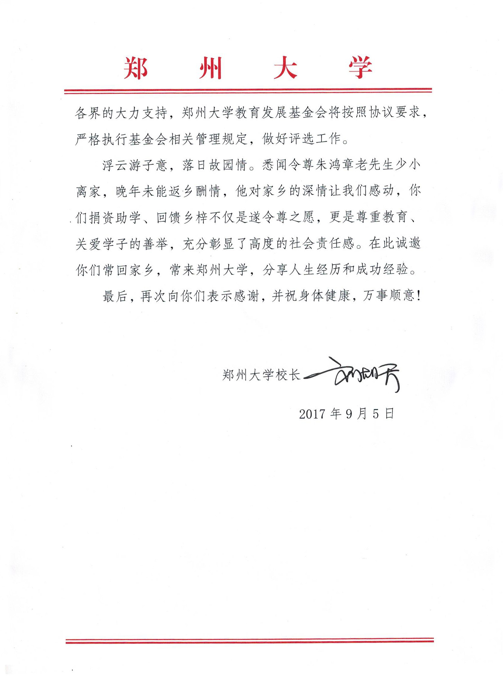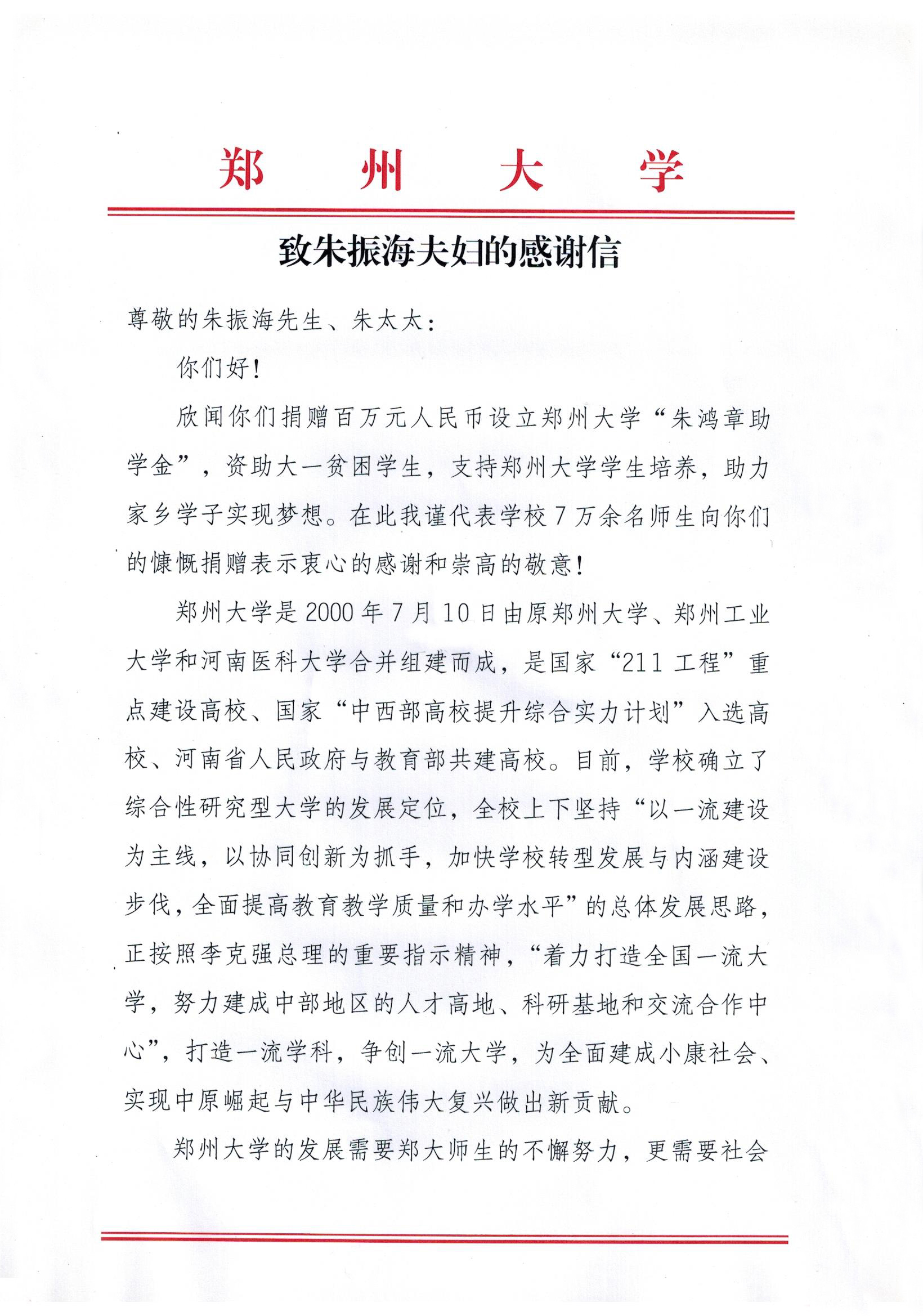 交谈中得知,朱振海夫妇通过网络新闻报道了解到郑州大学教育发展基金会的基本信息和项目管理情况。他们说,郑州大学是河南省重点高等学府、国家优秀人才培养基地,愿为郑州大学人才培养和贫困学子成才尽一份力量。朱振海先生说,此次捐资助学主要是为纪念先父朱鸿章先生对家乡的深情,回馈乡梓,鼓励贫寒学生刻苦学习、努力成才,促进家乡教育事业发展。据了解,朱鸿章先生祖籍河南省南阳市卧龙区大匡庄,少小离家,深切思念家乡,日日思念亲人,奈何天违人愿,难以返乡酬情。