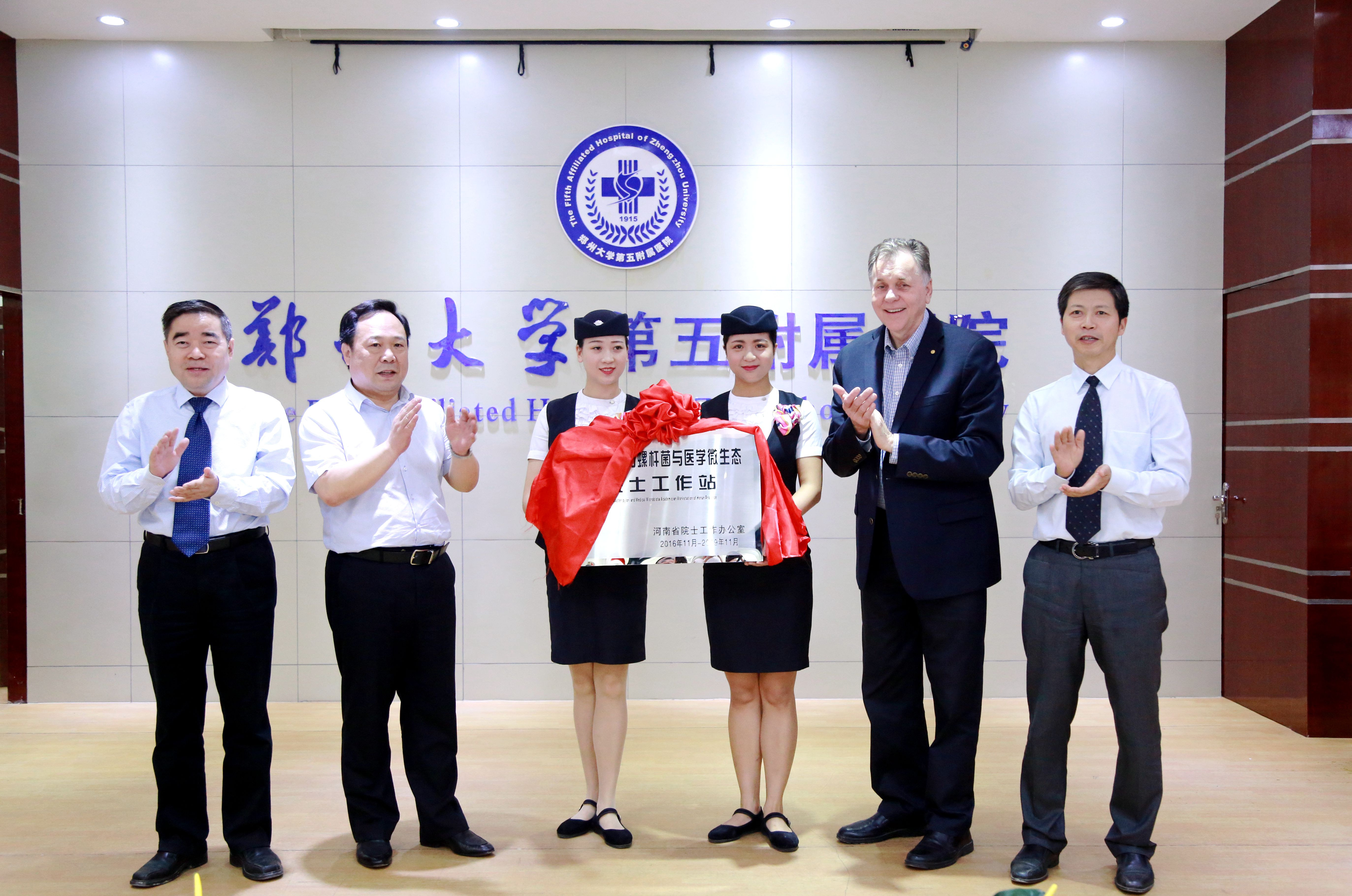 巴里•马歇尔教授、谷振清副校长、五附院院长郑鹏远和五附院党委书记王新军共同为河南省、郑州市幽门螺杆菌与医学微生态院士工作站揭牌。这标志着五附院将借助与巴里•马歇尔教授的合作,建设一个国际领先的幽门螺杆菌科研平台,对提升医院在河南省消化疾病领域的科研水平,提高我省幽门螺杆菌的临床防治能力,降低我省乃至全国的胃癌发病率具有十分积极的意义和良好的社会效益。