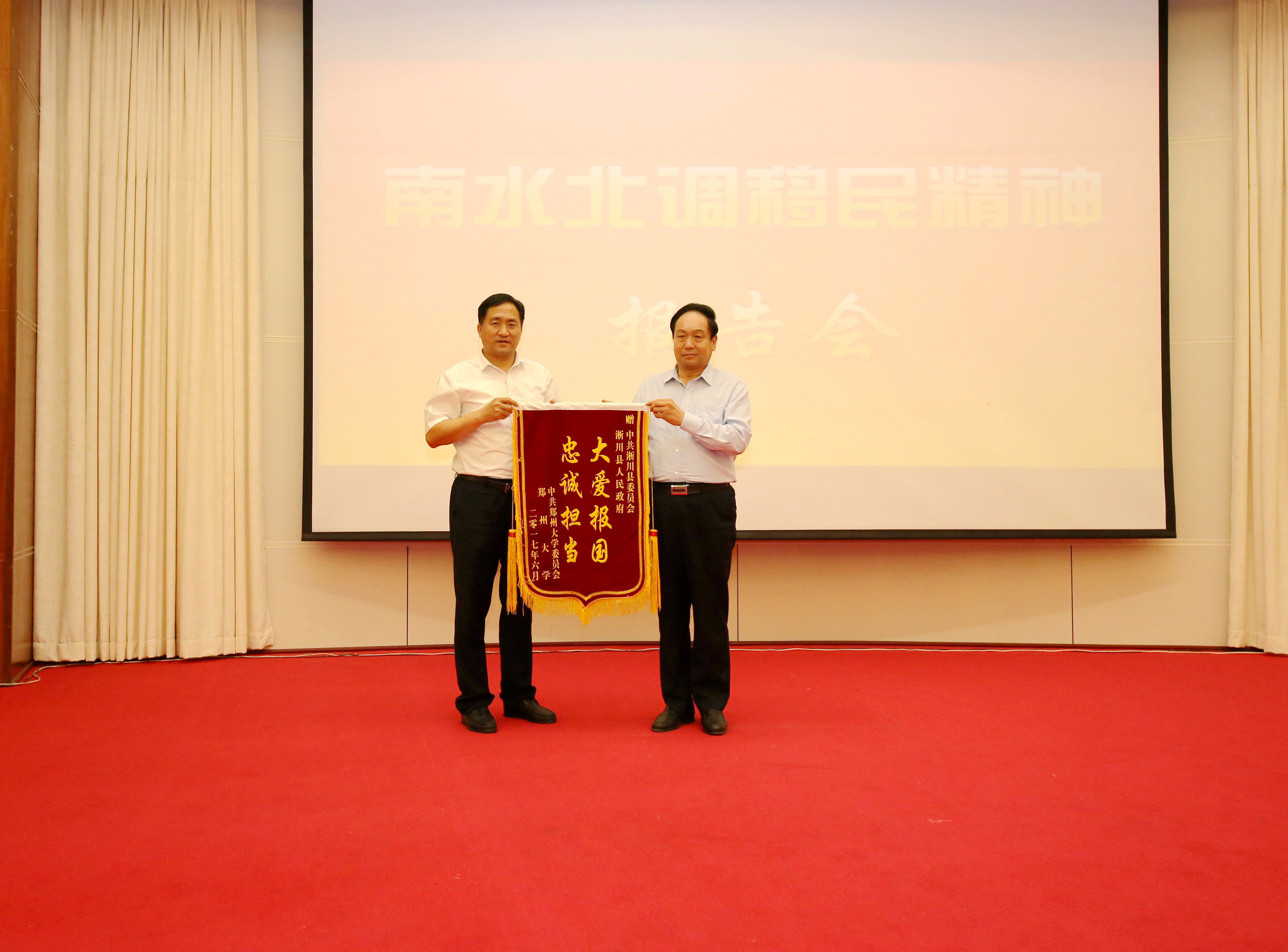最后,在热烈的掌声中,郑州大学党委书记牛书成代表学校向淅川县县长杨红忠赠送“大爱报国 忠诚担当”锦旗;郑州大学副校长关绍康与淅川县委常委、宣传部长梁玉振分别代表郑州大学和淅川县互相赠送了“源远流长”书画纪念品和南水北调中线工程渠首烙画。