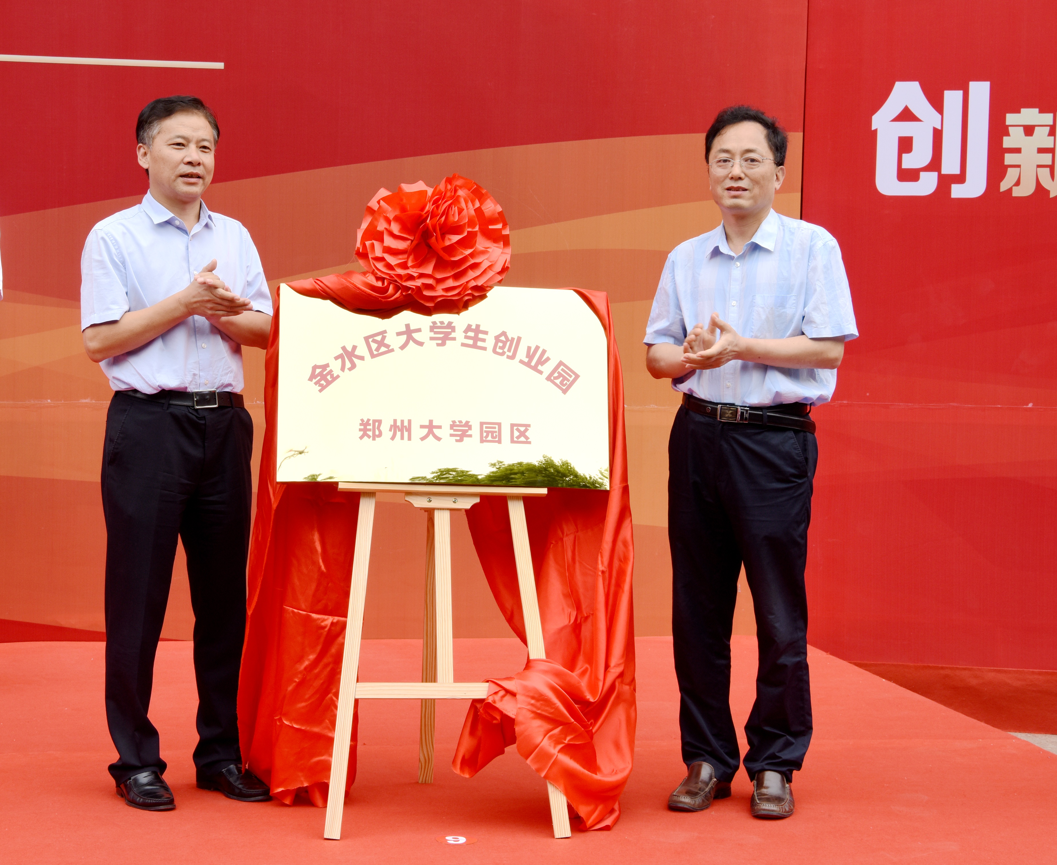 金水区区委书记陈宏伟和副校长关绍康共同为“金水区大学生创业园——郑州大学园区”揭牌