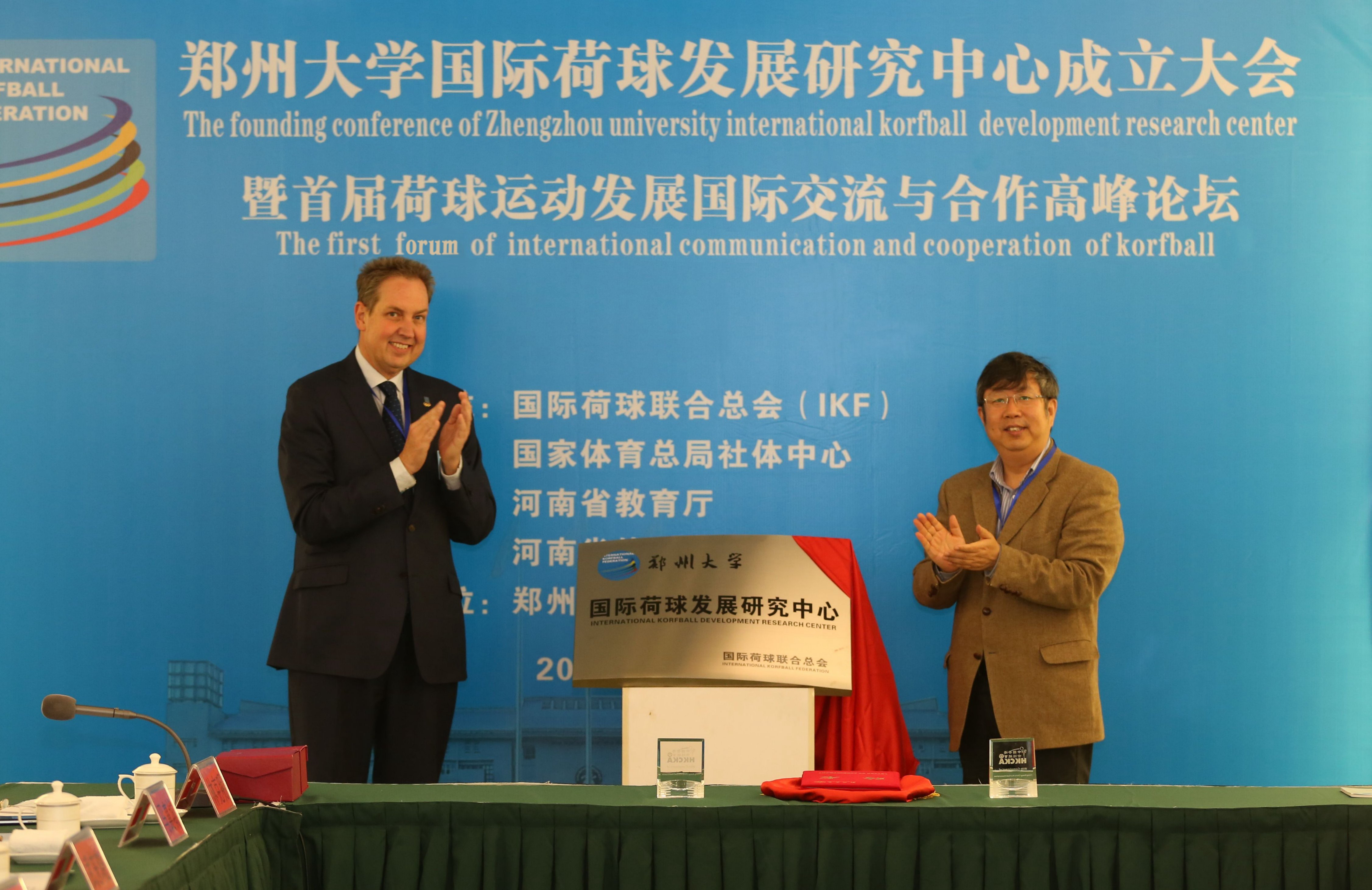扬•弗朗索主席和刘炯天校长共同为郑州大学国际荷球发展研究中心揭牌