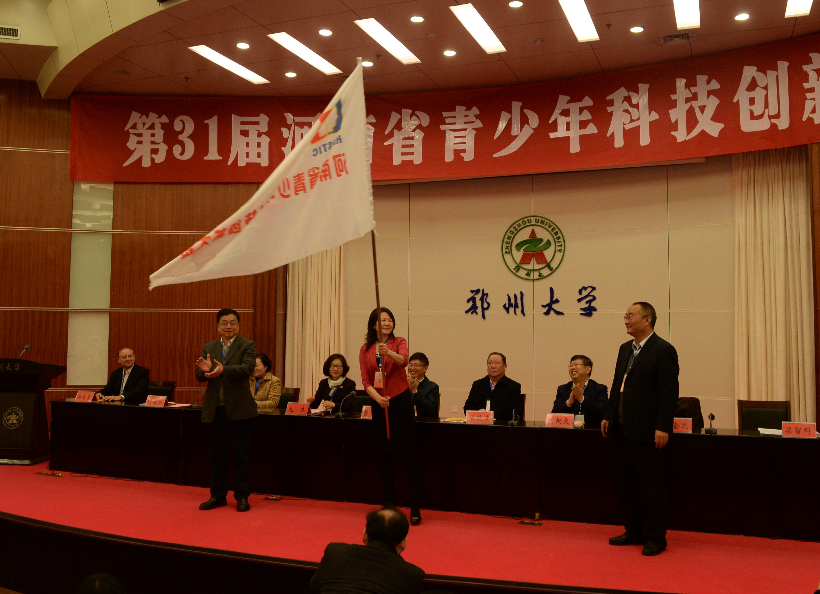 在会旗交接仪式上,郑州大学副校长刘国际在热烈的掌声中将大赛会旗交予省科协主席霍金花,霍金花主席再将会旗交予洛阳师范学院院长梁留科。梁留科院长表示将积极筹备下一届大赛,为各位参赛选手和专家学者提供良好的服务和环境。