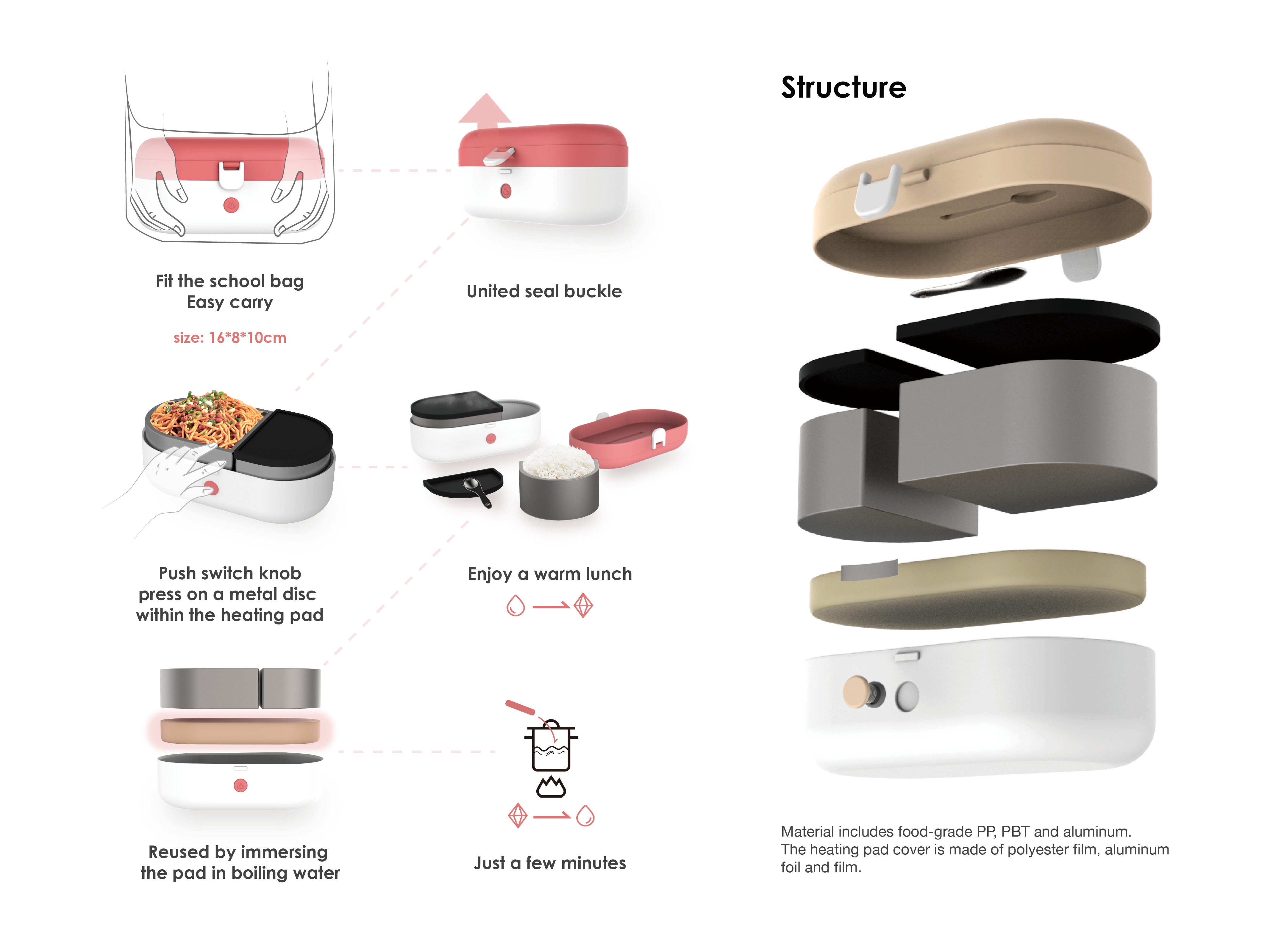 再加热餐盒从外形上看,与普通的餐盒没有什么不同,不过,在饭盒内部有一个加热模块,模块侧面有一块铁片,与餐盒的外部的按钮连接。只需按压按钮,饭盒内的加热模块即可生热,释放能量加热饭菜。