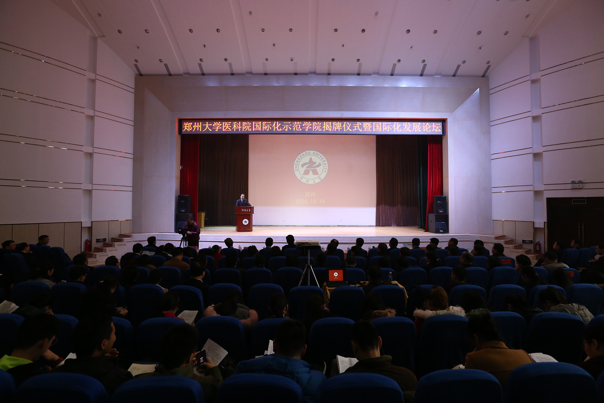12月19日,郑州大学医学科学院国际化示范学院揭牌仪式暨国际化发展论坛在东校区图书馆报告厅举行。国家外专局副局长周长奎、教科文卫专家司副司长王嵩、教科文卫专家司计划处处长炊海春,省人社厅厅长刘世伟、省外专局局长徐宗勤、省卫计委副主任黄红霞、省教育厅厅长助理荣西海,学校党委书记牛书成、副书记邢莹、副校长谷振清、副校长韩国河等领导出席揭牌仪式。学校有关职能处室领导,有关医学院系、机构领导和教师学生代表,附属医院领导和有关代表,新闻界朋友共计500余人参加仪式。仪式由校党委副书记邢莹主持。