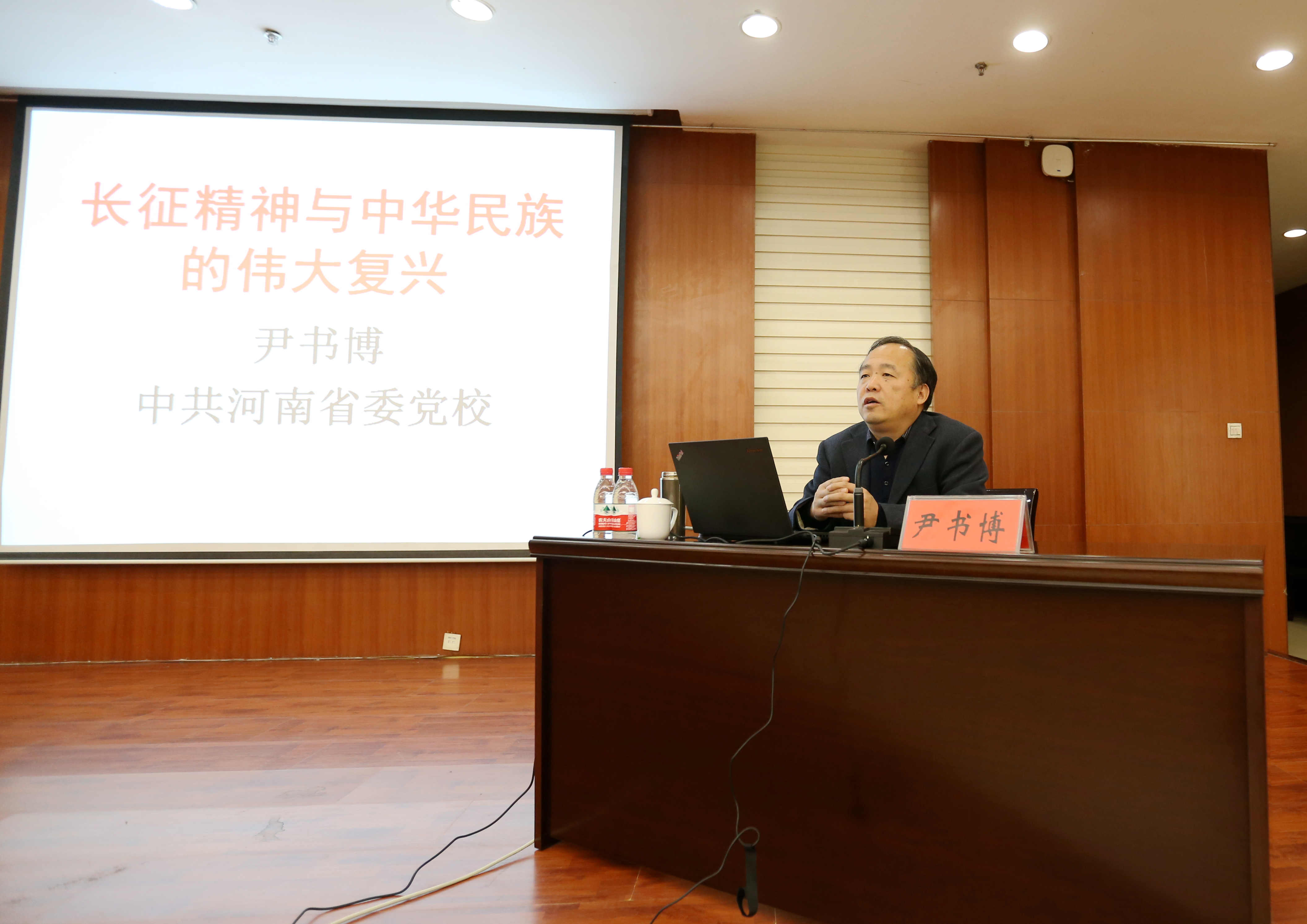 为了弘扬伟大的长征精神,深入学习贯彻习近平总书记纪念红军长征胜利80周年重要讲话精神,我校于10月28日上午举行校党委中心组(扩大)学习报告会,邀请河南省委党校副校长尹书博教授作了题为《长征精神与中华民族的伟大复兴》的专题辅导报告。全体在校校领导,校党委中心组成员,全校中层正职干部,全体辅导员和思想政治理论课教师代表参加了报告会。报告会由校党委书记牛书成主持。