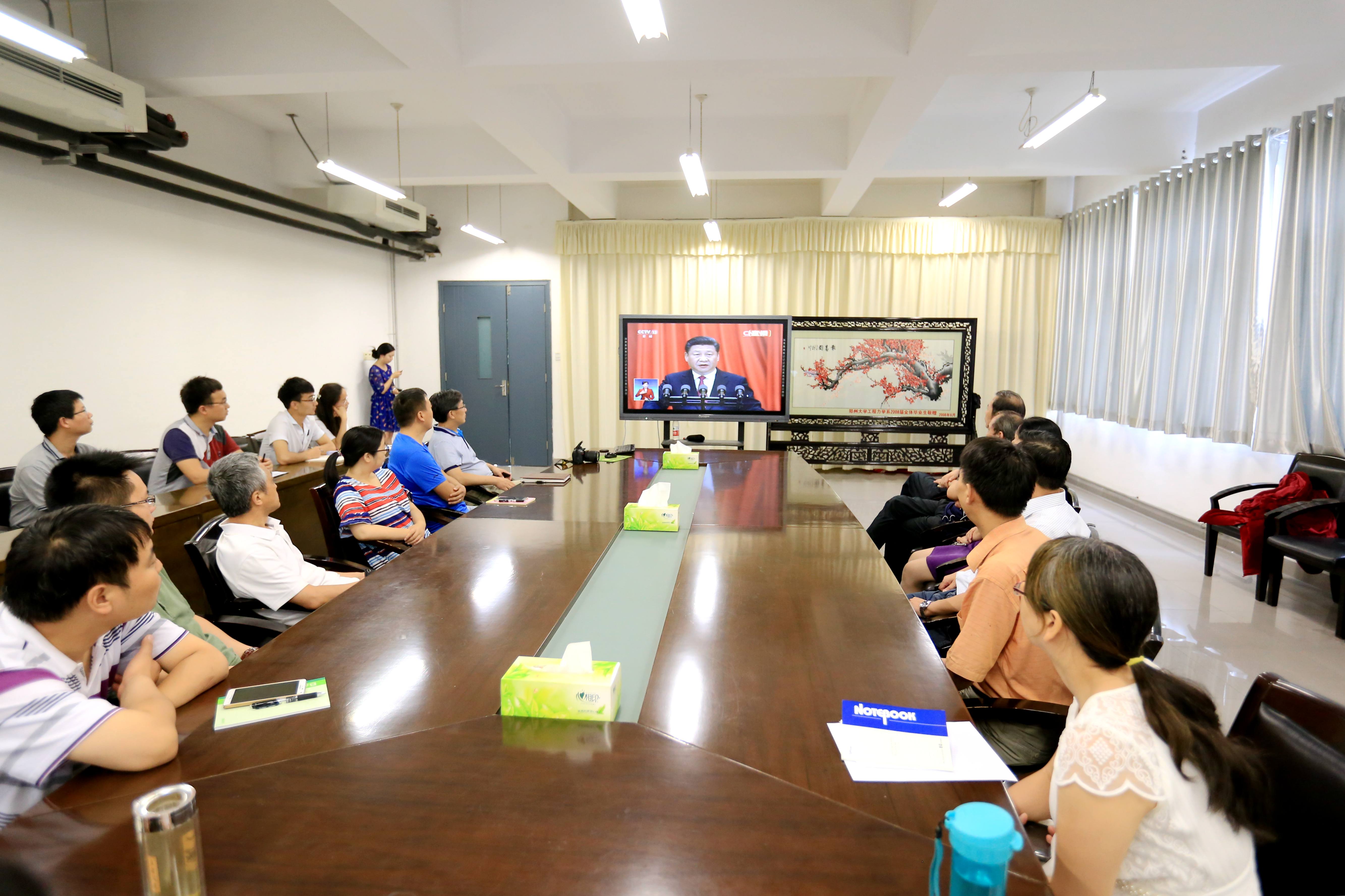 校团委、学生处、研究生院、离退休职工工作处、校医院、商学院、旅游管理学院、公共管理学院、法学院、文学院、新闻与传播学院、外语学院、马克思主义学院、教育系、历史学院、信息管理学院、音乐学院、数学与统计学院、化学与分子工程学院、物理工程学院、信息工程学院、电气工程学院、材料科学与工程学院、机械工程学院、土木工程学院、管理工程学院、力学与工程科学学院、基础医学院、公共卫生学院、临床医学院系、省医药科学研究院、护理学院、药学院、国际学院、后勤集团公司、第一附属医院、第二附属医院、第三附属医院、第五附属医院等单位分别组织党员干部、师生员工在办公室、会议室、报告厅等地集中收听收看了大会直播。