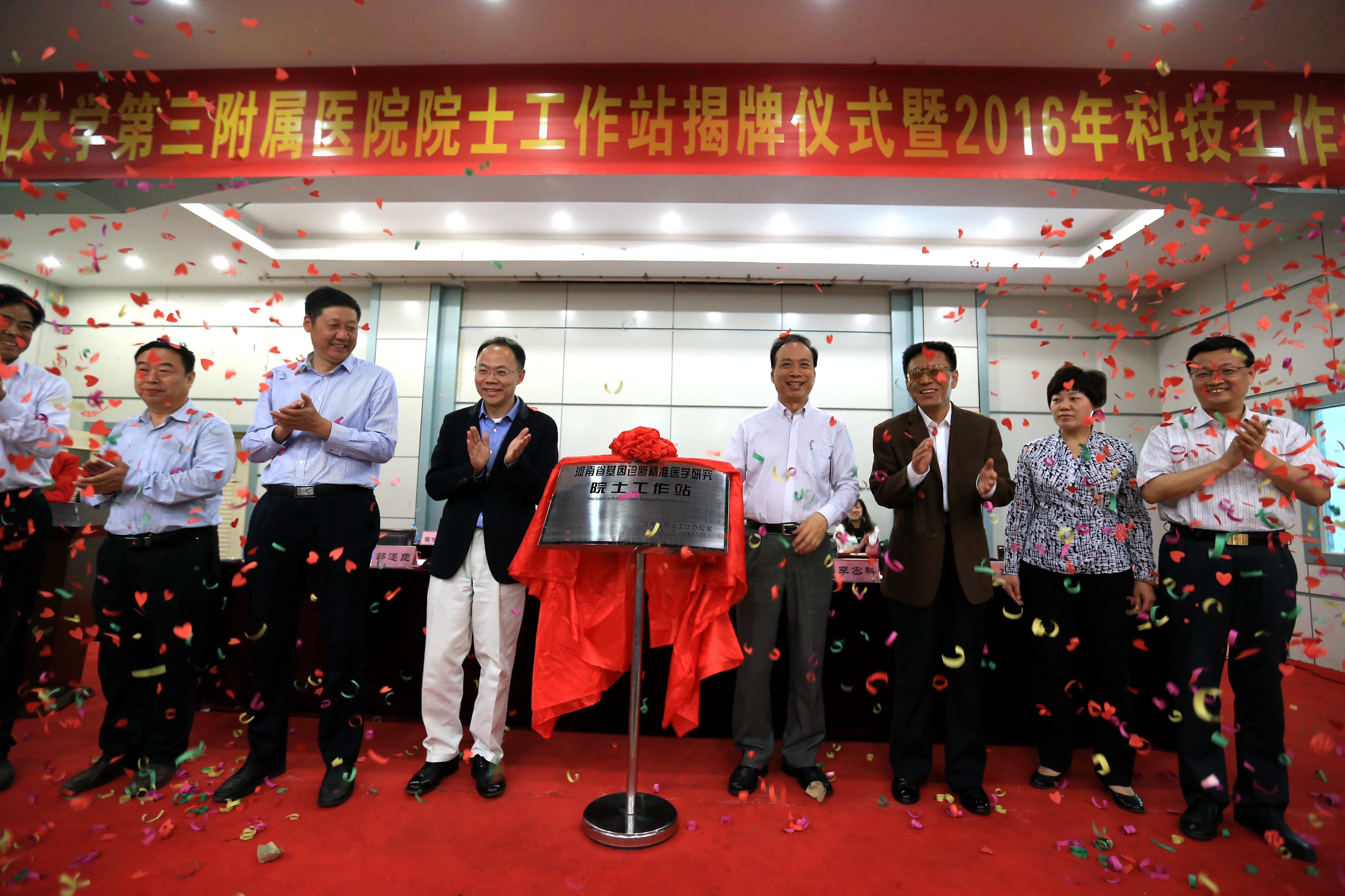 会上,河南省科技厅基础研究处处长郭遂臣宣读了在三附院成立河南省小儿脑损伤重点实验室的有关文件,李密科总工程师为实验室主任朱长连教授授牌。河南省科技厅院士办主任宋晖宣布河南省基因诊断精准医学研究院士工作站在三附院正式成立,与会领导为院士工作站进行揭牌。