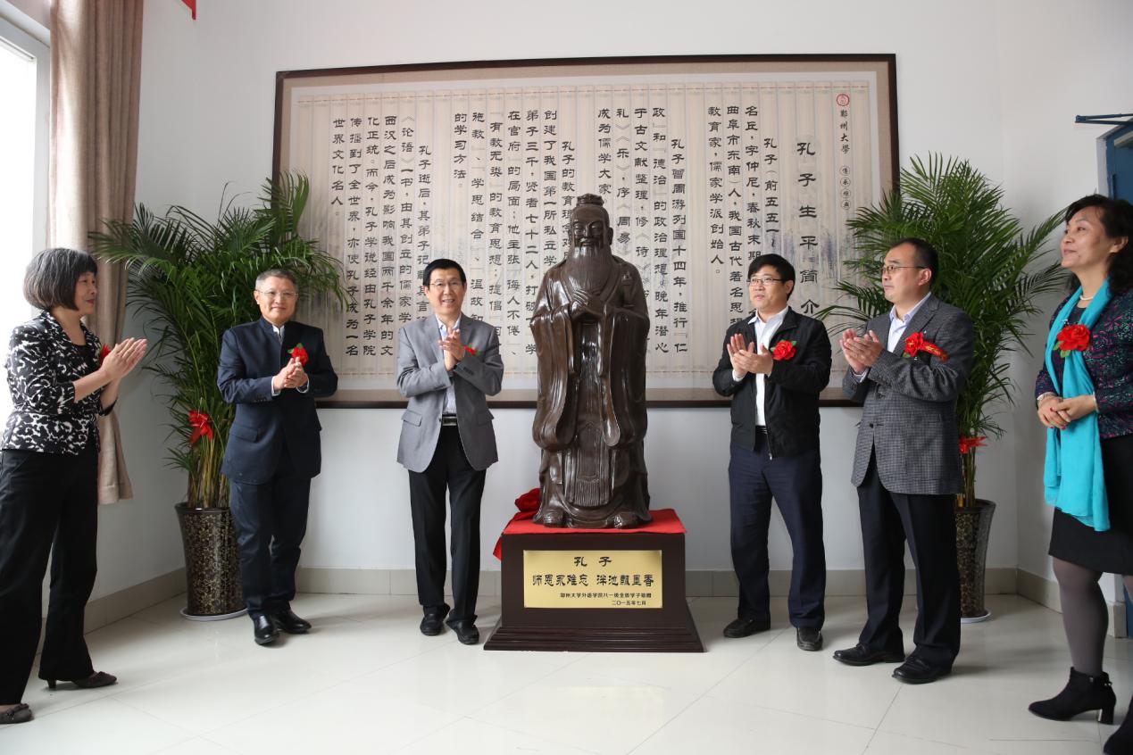 揭幕仪式上,李兴成副书记与校友、老师代表共同为孔子像揭幕。李兴成副书记致辞。他代表学校向返校校友表示欢迎和感谢。他说,今年是孔子诞辰2567周年,孔子精神和儒家思想作为中华文化精髓已经融入到我们华夏民族的血脉之中,孔子像的落成将激励更多师生务实勤奋、勇担使命,为实现中华民族伟大复兴努力奋斗。他向校友们介绍了学校国学教育和对外汉文化传播的发展历史和所取得的成就。他说,2004年以来郑州大学成立了嵩阳书院,并分别在印度和美国开办了孔子学院和孔子课堂,致力于传承和弘扬中华文化,其中外语学院培养了大量具有专业素养的优秀校友,遍布全球各地,成为中外文化交流的使者,为增进中外友谊做出了重要贡献。