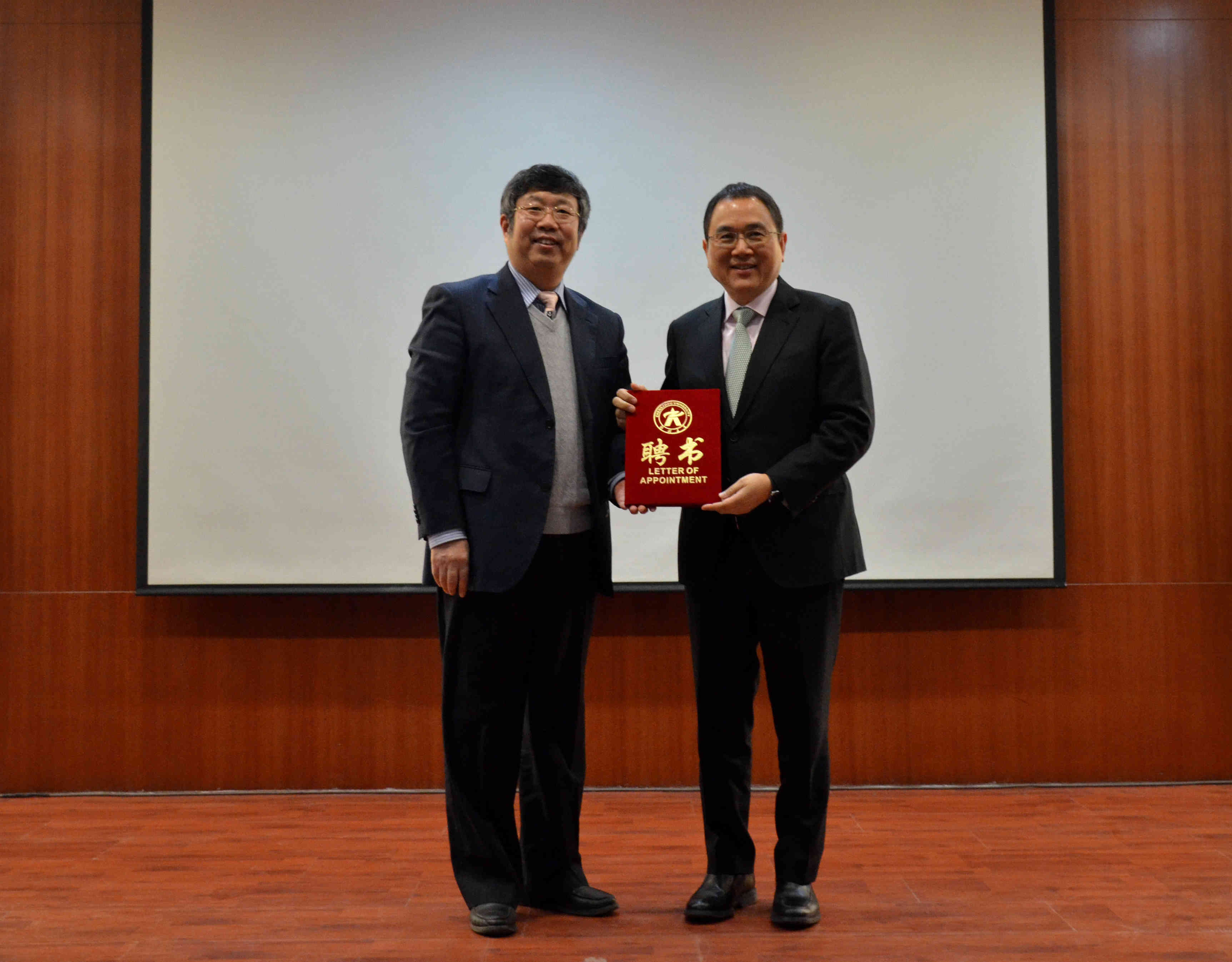报告会前,校长刘炯天院士向张志忠先生颁发了郑州大学兼职教授聘书,并与来访客人进行了会谈交流。刘校长向客人们介绍了学校近几年在人才培养、科学研究、学科建设、社会服务等方面所取得的成就,并特别介绍了学校在中原文化、文化创意研究等方面融入地方经济发展的经验做法。