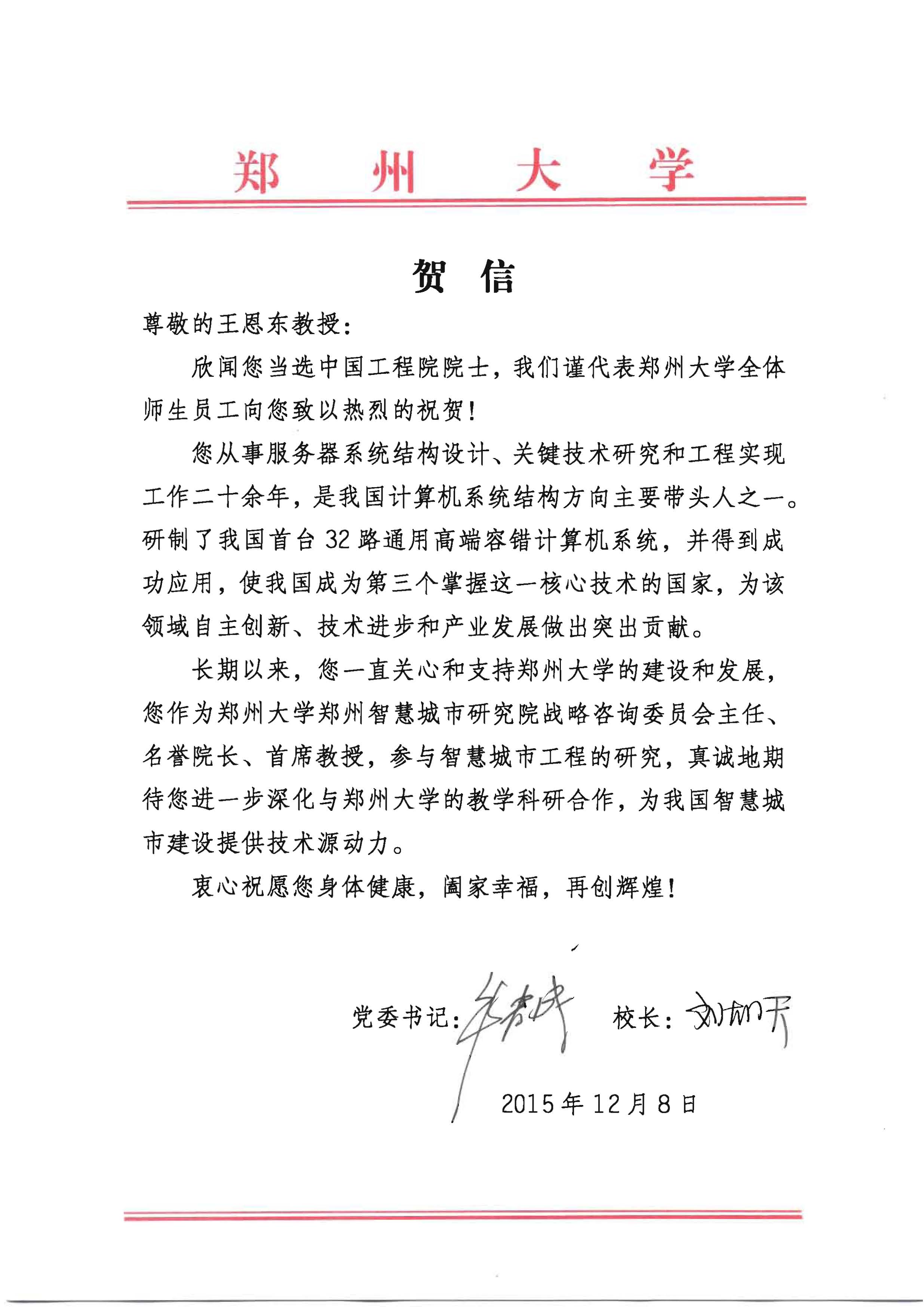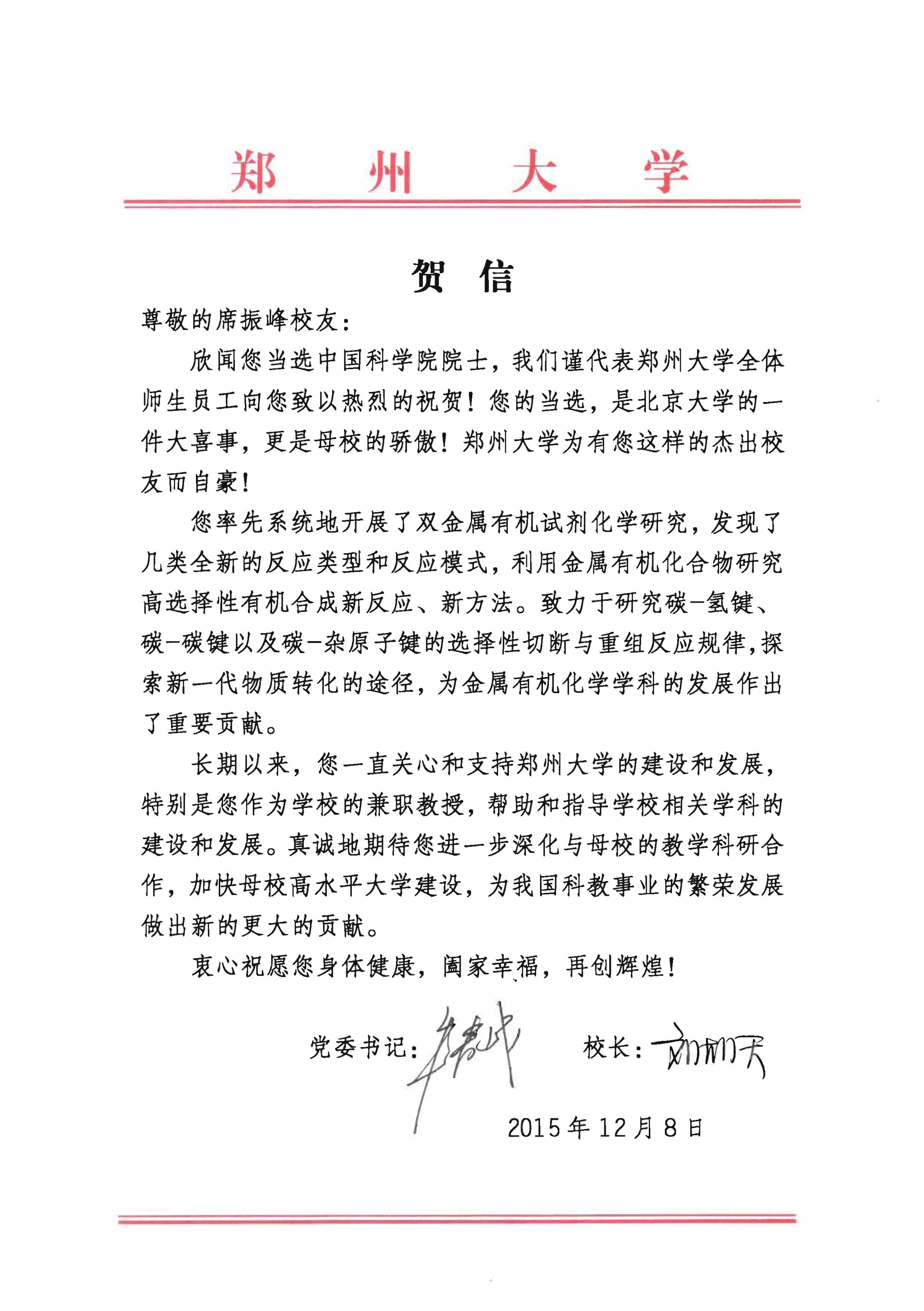 欣闻您当选中国科学院院士,我们谨代表郑州大学全体师生员工向您致以热烈的祝贺!您的当选,是北京大学的一件大喜事,更是母校的骄傲!郑州大学为有您这样的杰出校友而自豪!