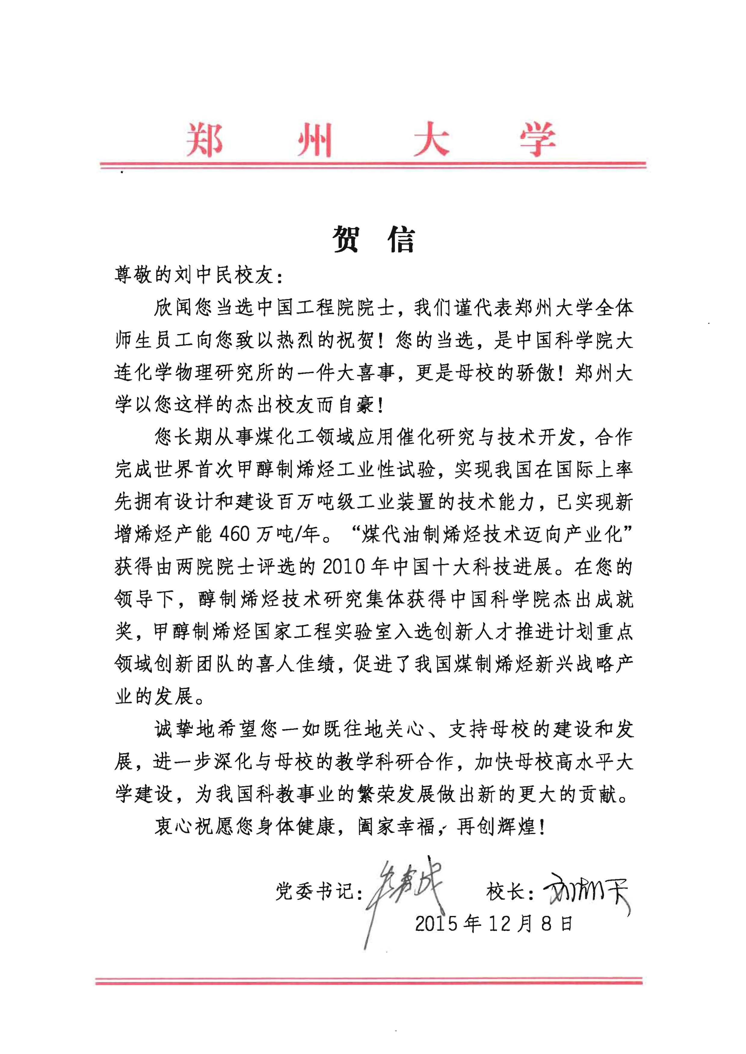 欣闻您当选中国工程院院士,我们谨代表郑州大学全体师生员工向您致以热烈的祝贺!您的当选,是中国科学院大连化学物理研究所的一件大喜事,更是母校的骄傲!郑州大学以您这样的杰出校友而自豪!