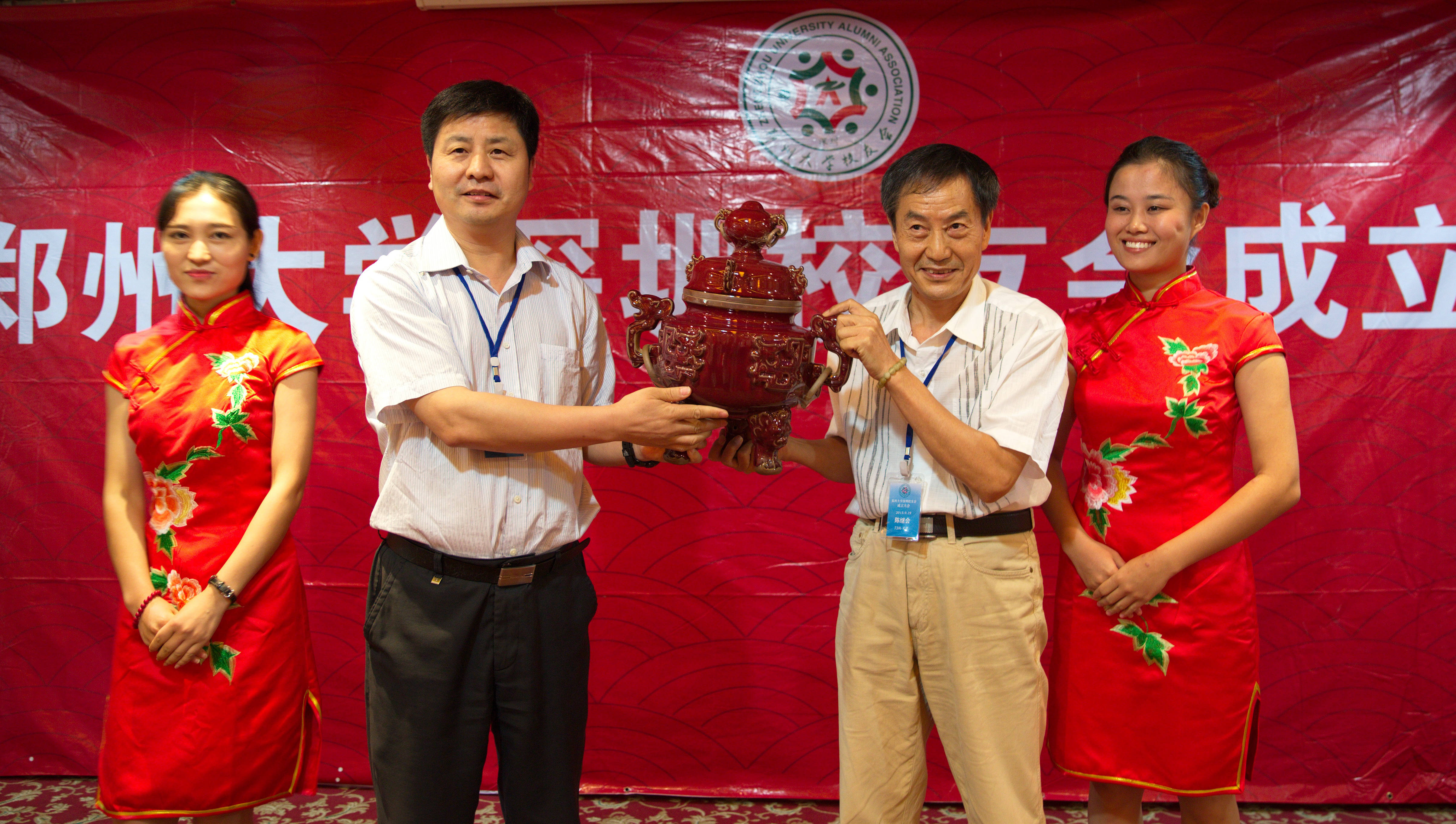 王宗敏副校长宣读第一届组织架构当选名单,并代表学校向郑州大学深圳校友会赠送钧瓷“三足立鼎”,寓意广大校友凝心聚力为祖国的昌盛和母校的繁荣贡献力量;陈继会会长代表郑州大学深圳校友会向母校回赠题为“嵩岳巍峨雄峙中原,长河万里奔流归海”的书法礼品,以嵩山和黄河借喻母校,祈福母校“领袖学林,天地锦绣”。