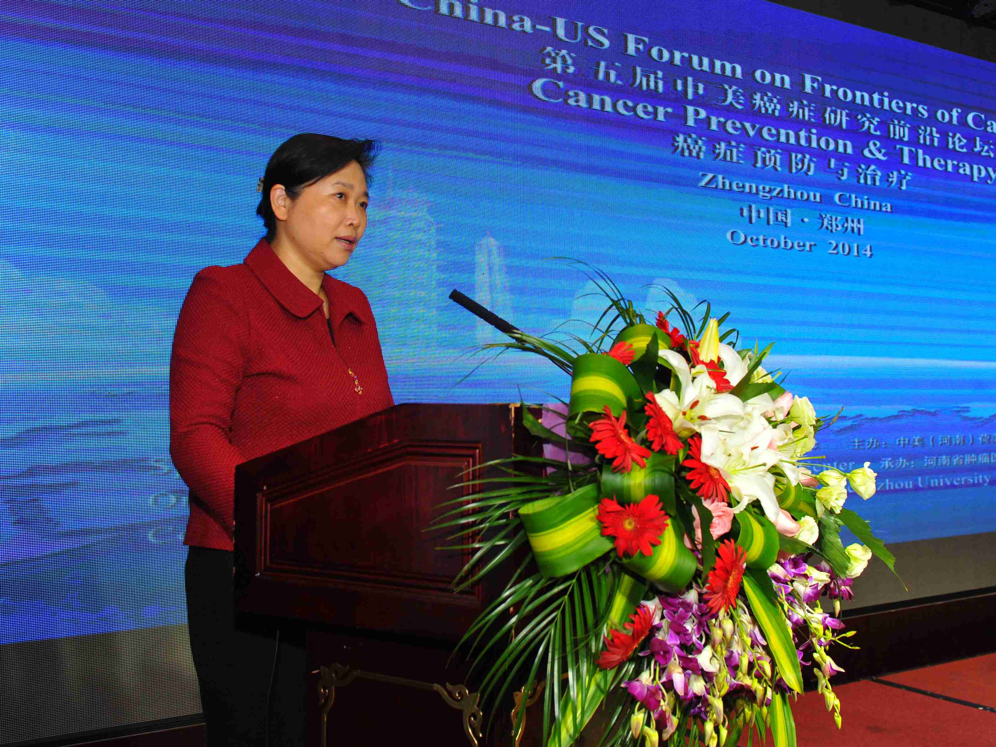 河南省人民政府副省长王艳玲致辞,她说,近年来,河南省在肿瘤防治方面,始终坚持“预防为主”和“以农村为重点”的原则,投入了大量人力、物力、财力,不断加大肿瘤防治力度,先后在林州市等9个县(市)开展食管癌早诊早治项目,在沈丘等4个县(市)实施淮河流域癌症综合防治项目,在全省15个县(市)实施肿瘤发病登记,在19个县(市)开展以肿瘤为主的死因登记监测,覆盖人群达1400万人以上。经过努力,一些高发肿瘤发病趋势有所遏制。她希望并相信,这次论坛一定能够为预防和减少癌症发病率探索新思路与新途径,为进一步促进癌症防治领域的蓬勃发展做出新贡献。