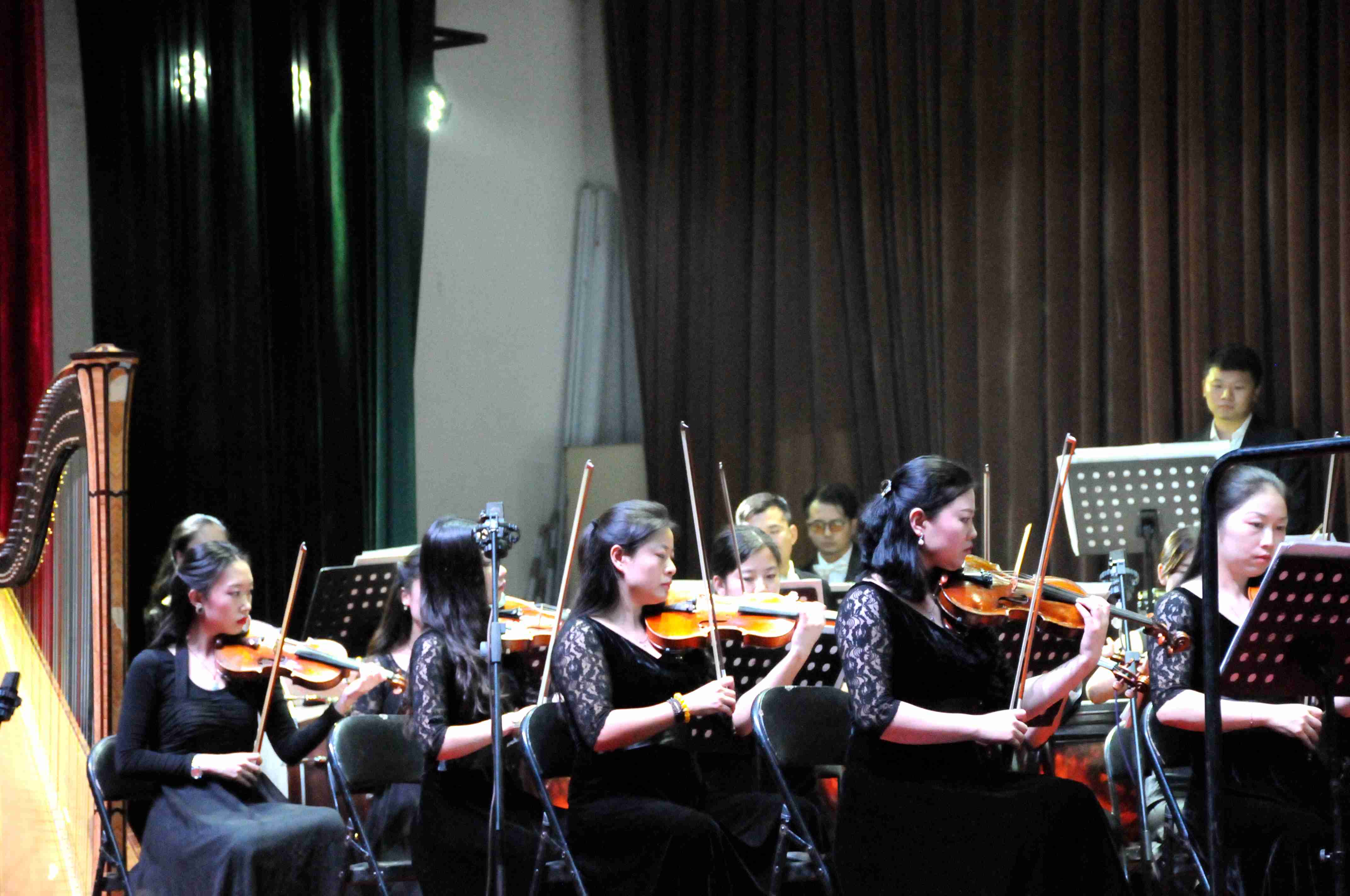 在近两个小时的时间里,河南交响乐团为广大师生奉献了一场丰盛的音乐和文化盛宴。此次音乐会在《蝙蝠序曲》喜庆的乐曲声中拉开帷幕,随后,由年近70岁高龄的著名音乐指挥家岳辉先生指挥,期间,乐团演奏的舞剧《红色娘子军》选曲、《天鹅湖》、《波基上校》、《掀起你的盖头来》等一首首经典的乐曲在报告厅精彩奏响,风格迥异的乐曲时而欢快、轻灵,时而奔放、粗犷,现代震撼的节奏、优美酣畅的韵律仿佛将与会师生缓缓带入了高雅的音乐殿堂。女声独唱《芦花》、《龙船调》、长笛情景演奏、动漫电影音乐作品《龙猫》、《风之谷》等经典乐曲缤纷华丽,充分展现了交响乐超越时空的独特魅力。整场演出高潮迭起,师生观看节目热情高涨,现场观众欢声雷动,在规定曲目演奏完毕,观众意犹未尽,请出乐团为师生加演数曲,演出结束,全场观众报以热烈的掌声表达对乐团的无限崇敬和深深谢意。