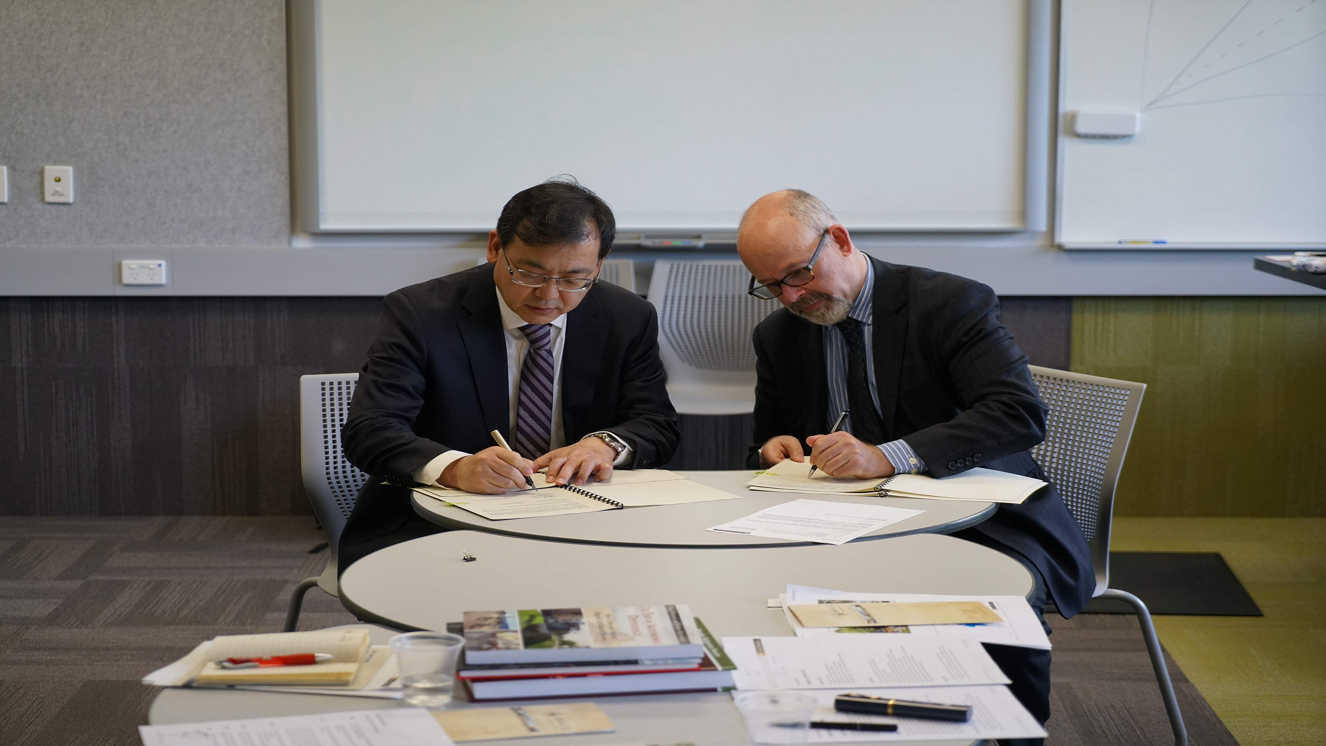 在维多利亚大学,韩国河副校长与该校负责国际事务的副校长Julia•Jones教授、主管理工学科的副校长Mike•Wilson教授、工程与计算机科学学院院长Stuart•Marshall教授、建筑与设计学院院长Marc•Schnabel教授以及来自历史学院、商学院、应用语言学院的专家教授等进行了会谈。韩国河副校长介绍了我校历史沿革、学科特色、科学研究、社会服务、国际合作等情况,并着重介绍了我校海外虚拟研究院的建设情况。Julia•Jones和Mike•Wilson两位副校长对我校代表团的来访表示欢迎,希望与我校在博士生联合培养、师资培训、学术交流等方面开展合作。韩国河副校长和Julia•Jones副校长代表双方学校签署了校际合作备忘录,信息工程学院副院长齐林与该校工程学部副主任张孟杰教授签署了博士生联合培养协议书。